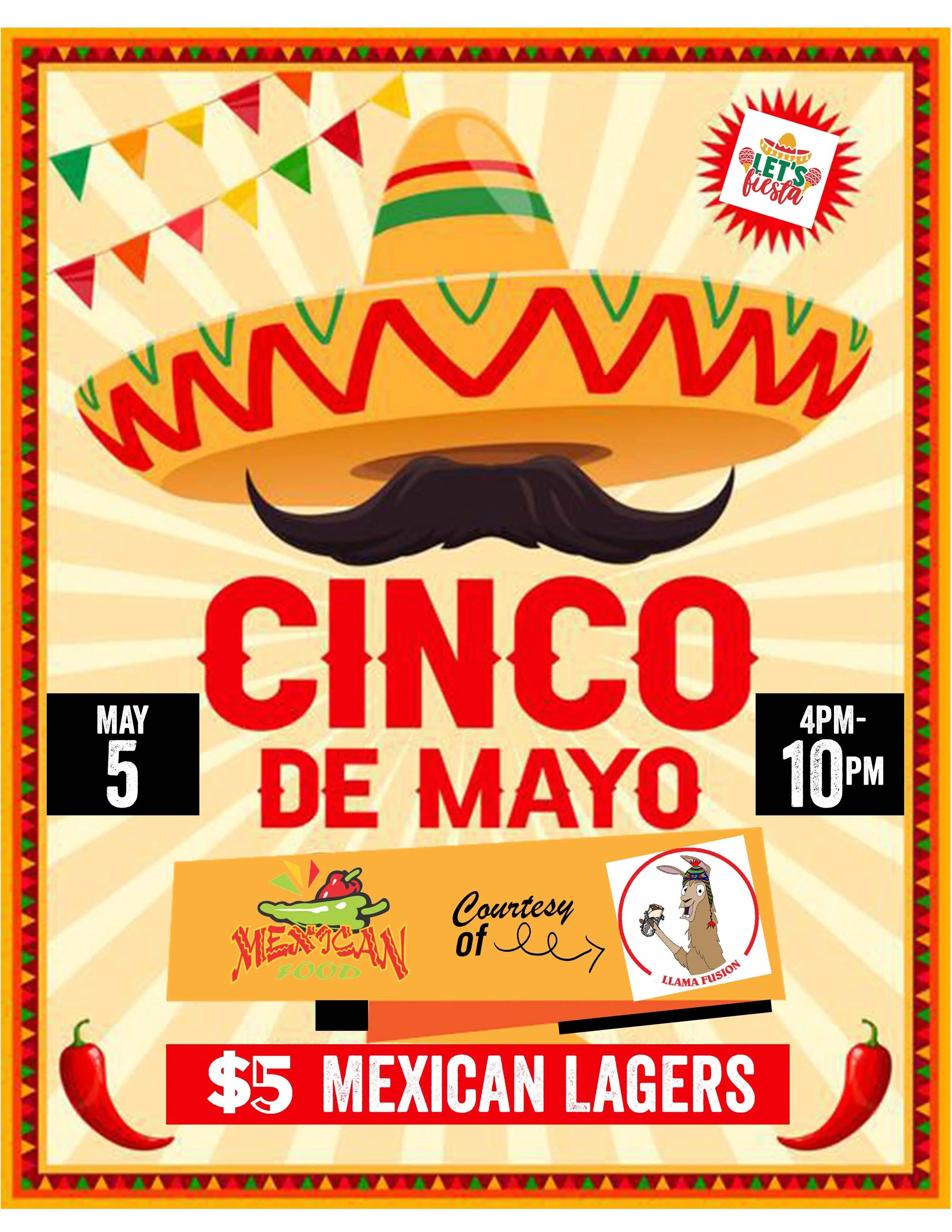 Let's Fiesta! Tacos & Mexican food courtesy of Llama Fusion Food Truck, plus, Mexican Craft Beer Specials all night long!