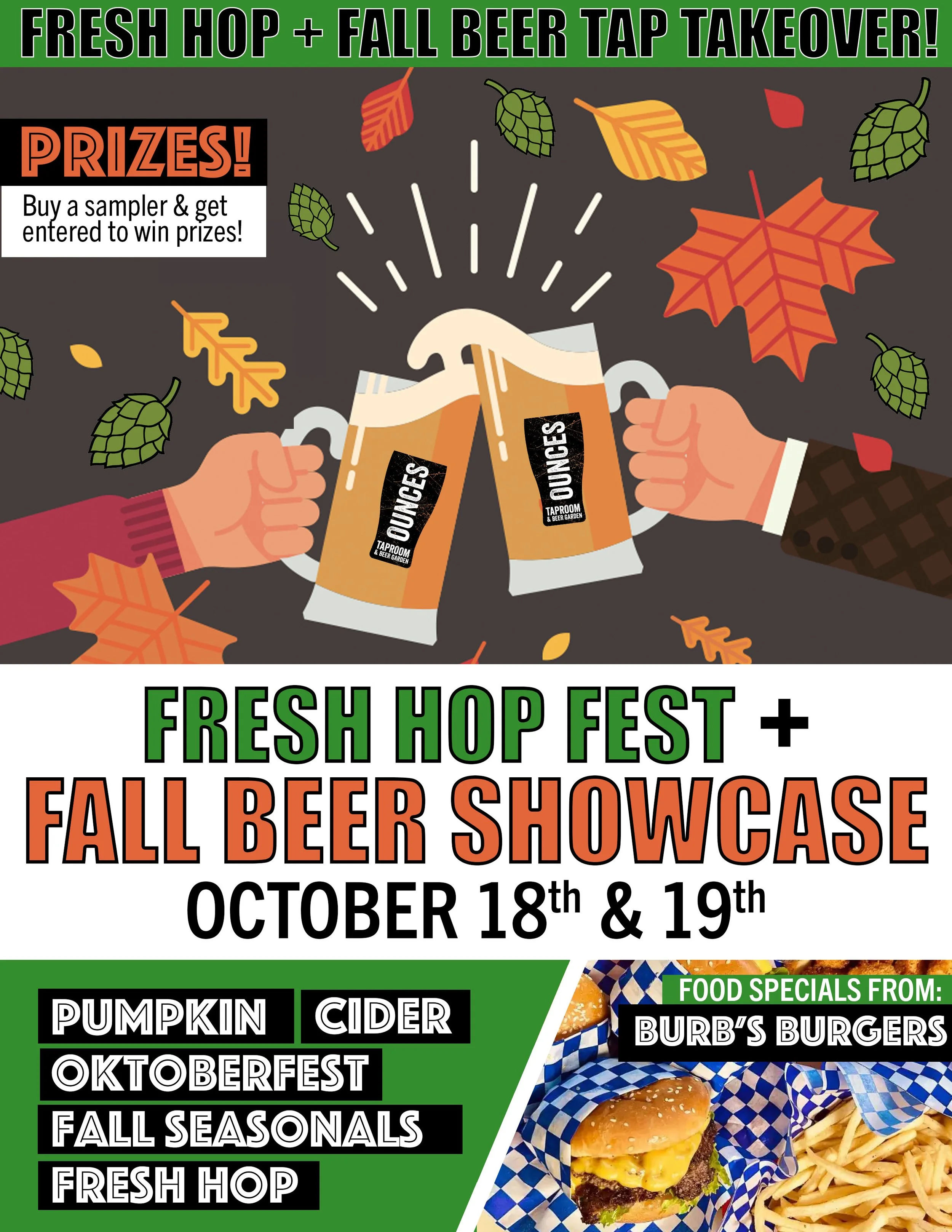 For one weekend only! Stop in to sample the season! 30 taps of nothing but Fresh Hops, Oktoberfest, Pumpkin, Cider and Fall Seasonals! Try one, try them all!