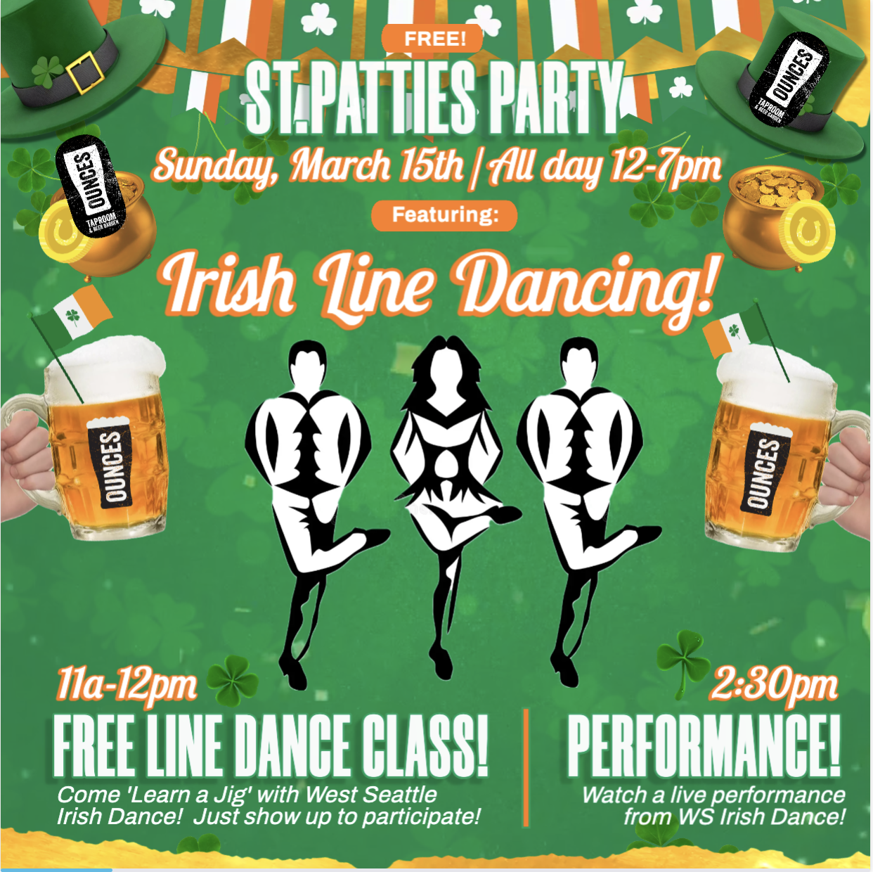 Come ‘learn a jig’ from West Seattle Irish Dance! They’ll be at Ounces on Sunday, March 15th from 11am-12pm, offering a FREE Class to teach you the basics of Irish Line Dancing!